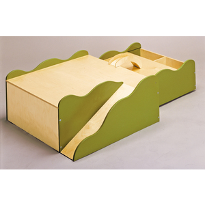 Table basse gigogne idéale pour jouer et prolonger les univers : ferme, maison, garage… Elle est composée de 2 parties : plan supérieur avec rampe d'accès pour véhicules, plan inférieur coulissant sur caisson de rangement à roulettes. Liaison par petit pont en bois.• En bois contreplaqué verni incolore et laqué vert.