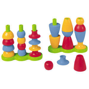 L'enfant enfile ces pièces sur des tiges et associe librement les formes simples et les couleurs vives.Contenu : 24 pièces en matière plastique (4 formes et 3 couleurs) et 2 socles