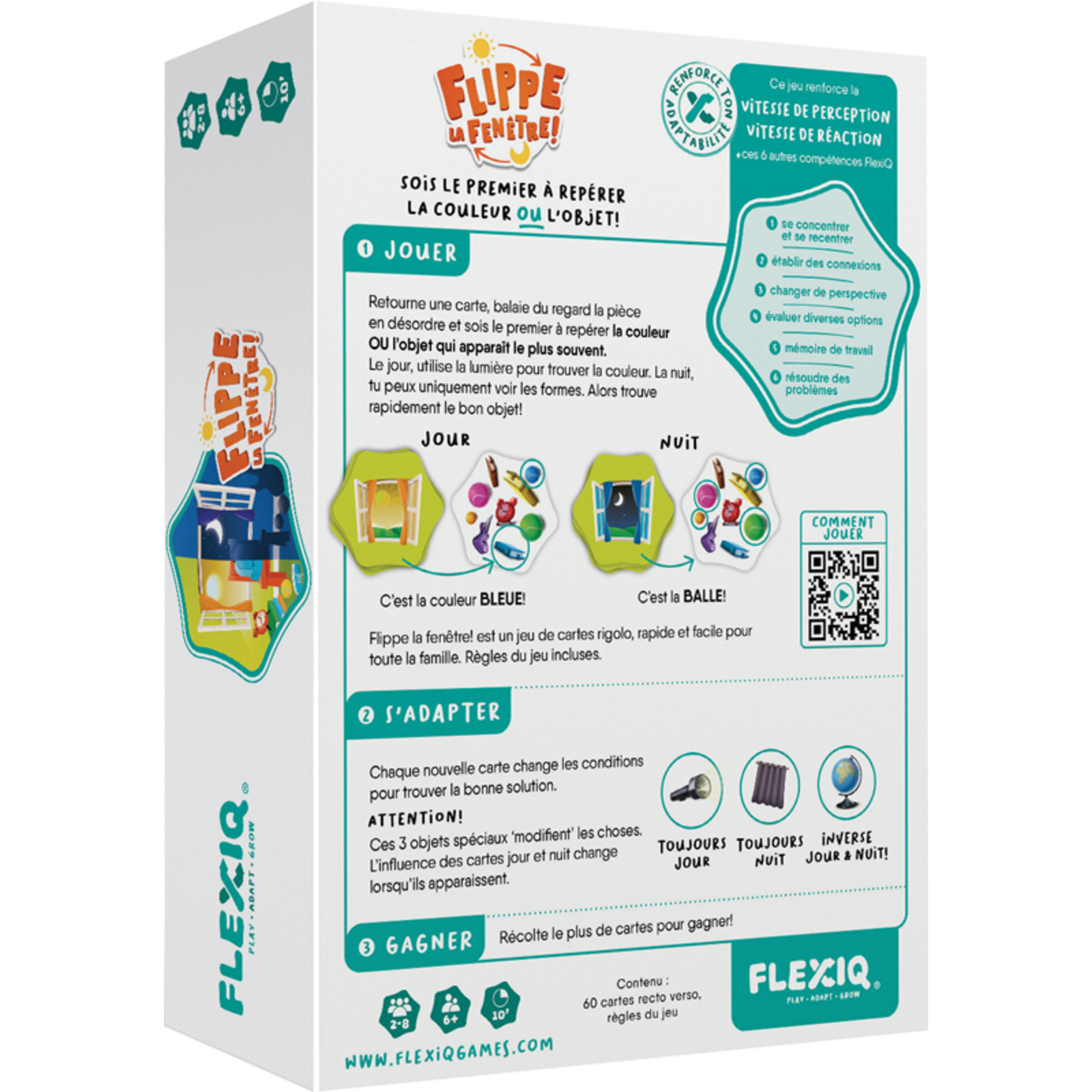 But du jeu : adapte-toi en un instant aux circonstances par ‘jour’ ou par ‘nuit’, et sois le premier à repérer la couleur ou la forme la plus visible. Cependant, méfie-toi des objets spéciaux ! Retourne une carte, observe la pièce en désordre et repère en premier la couleur ou l’objet qui apparaît le plus souvent. Le jour, utilise la lumière pour trouver la couleur. La nuit, tu peux uniquement voir les formes.Contenu : 60 cartes double face et 1 livret de règles2 à 8 joueurs - Durée : 10 min